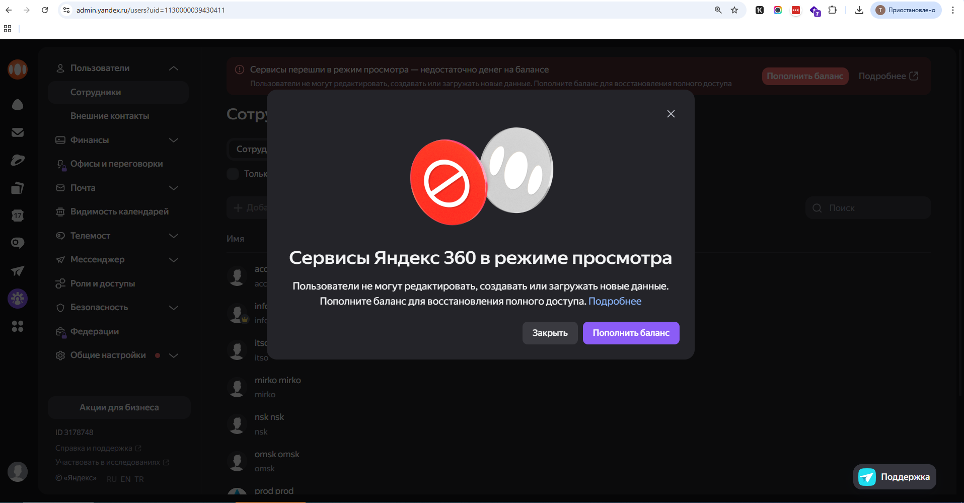 Надпись "Сервисы перешли в режим просмотра - недостаточно денег на балансе. Пользователи не могут редактировать, создавать или загружать новые данные. Пополните баланс для восстановления полного доступа".
