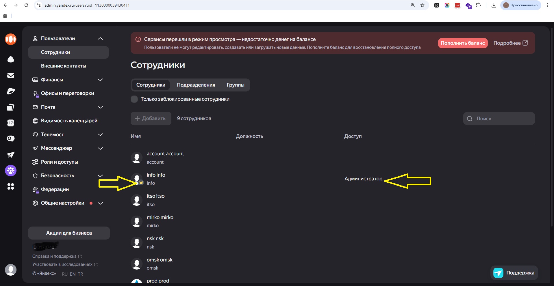 С получением роли Администратор на ящик info@ открывается вот такое окно сайта admin.yandex.ru , где толстыми жирными буквами висит надпись "Сервисы Яндекс 360 в режиме просмотра". Окей! Знаем и ожидаемая ситуация. Жмём на крестик, сворачивается поп-ап окно, становится доступен интерфейс Сотрудники левого меню.