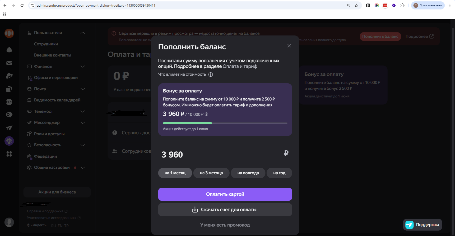2. оплатить тариф, нажав кнопки Пополнить баланс, предлагаемая сумма к оплате выскочила за год, переводим флажок за месяц в размере 3960 руб за 8 шт, 495 руб/шт (по сравнению с 2023 годом цена выросла в 2 раза).