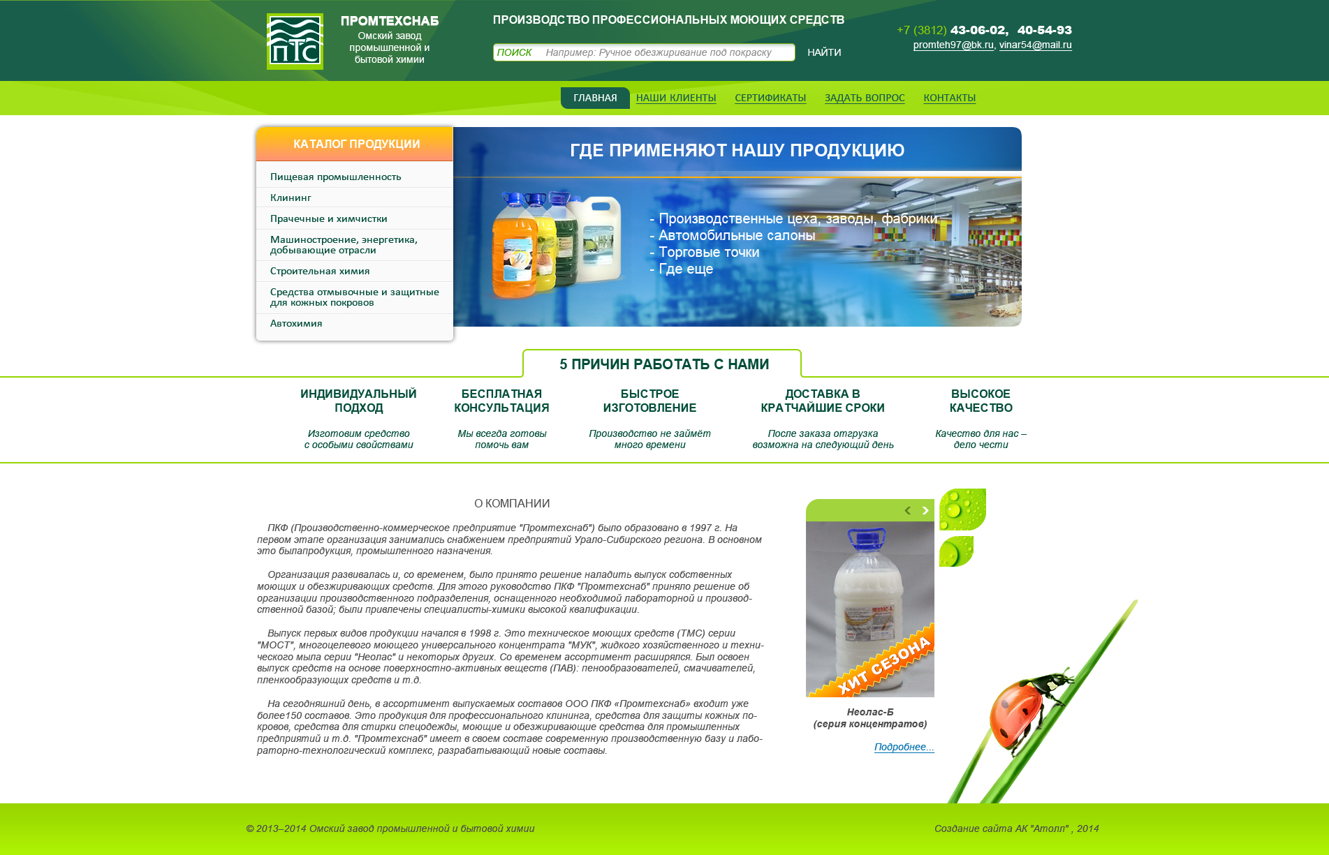 Разработка сайта-каталога моющих средств с возможностью быстро найти нужный товар вылилась в трансформацию структуры каталогизации на самой заводе. И в этом уже плюс нашего сотрудничества, так как продавать из головы и по памяти – это хорошо для незаменимого менеджера, а вот выдать информацию в открытый доступ – это значит научить продавать твой товар всех контрагентов. А именно увеличение продаж оптовыми партиями дилерами завода – такая задача была перед нами.