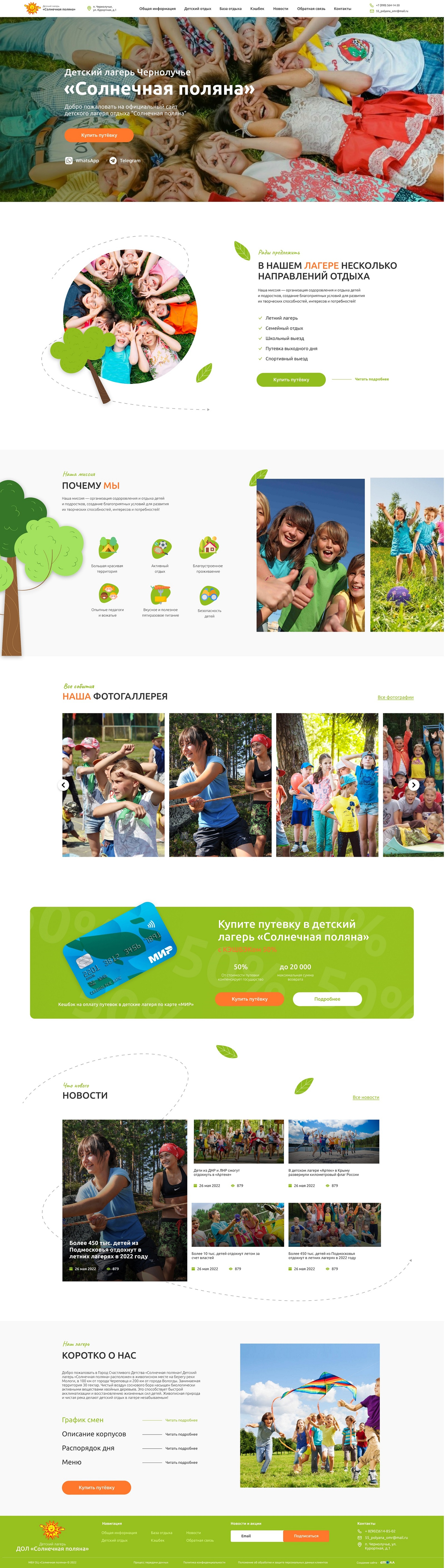 Наверное, самая любимая категория сайтов – детская! Позитивная, солнечная, радостная версия сайта детского лагеря разработана для образовательного учреждения для участия в программе возврата кешбека за путевку отдыха по России! Поэтому много точек касания «Купить путевку» и «Получить кешбек». В остальном сайт также соответствует ФЗ «Об образовании» к требованиям образовательных сайтов