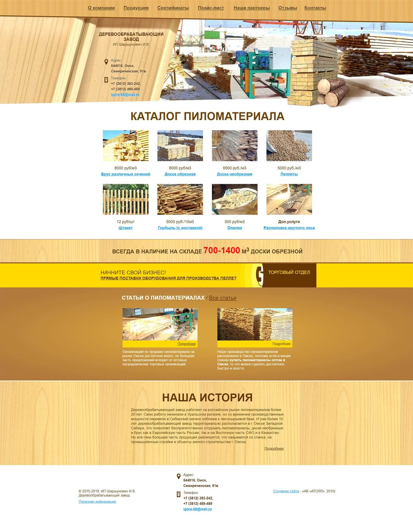 Сайт для ТПК "Деревообрабатывающий завод" из нашего типового проекта "Сайт-визитка", можно сказать классический вариант. Веб-дизайн по структуре: верх шапка в тему бизнеса, кнопки главные в ряд, иконки важных услуг по центру, ниже закрывающие слова о компании и периодическая текстовая информация. Попробовали две версии. Один вариант был с рисованными иконками каталога ( доски, даже опилки и пеллеты), т.к. чужие фотографии ставить не хотелось. Получилось легко, красиво, но заказчик посчитал, что сильно гламурно. Надо были поменять на ощущения солидности, надежности, мощи, объемов.