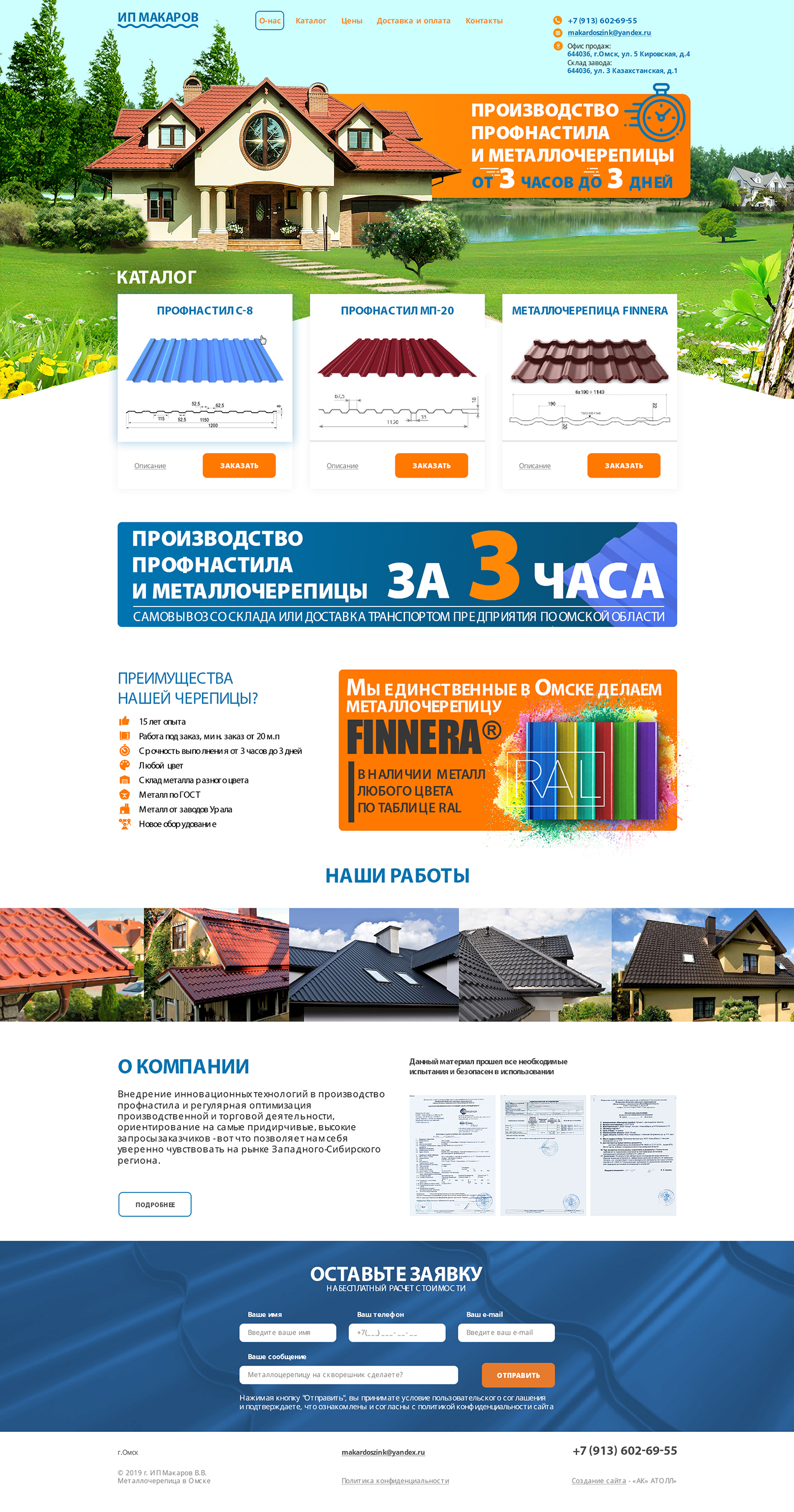 Результат разработки типовой визитки: отталкивались от целевой аудитории, а это в основном владельцы коттеджей, поэтому в дизайне стартовый экран впечатляет красивой фотографией с крышей и забором. Сделали акцент в виде больших заголовков и баннеров на слове "3 часа и под заказ". Второй акцентный баннер на продукцию и закрывашка из фотографий с объектов, где смонтировала металлочерепица. Форма сбора заявок пересылает их на почту менеджера. Остальные 5 страниц вполне привычного информационного вида.